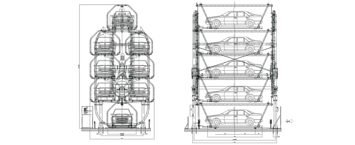垂直循環(huán)類機械停車設(shè)備采用與地面垂直方向做循環(huán)運動達(dá)到存取車輛的目的。工作原理為通過減速電機帶動傳動機構(gòu),在牽引鏈條上每隔一定距離安裝一個存車托架,存車托架隨鏈條一起做循環(huán)運動。